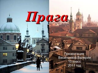 Документ представляет собой презентацию о Праге с основными фактами, включая площадь 496 км² и население 1,22 миллиона человек. Он описывает исторические и культурные аспекты города, такие как наличие средневековых башенных часов и Карлового моста, а также языки и религию населения. Основной язык — чешский, а большинство граждан исповедует католицизм.