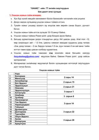 ангийн оюутнуудын бие даалт өгөх хугацаа 1. Уншсан номын тойм өгөхдөө: 1. Хүн бүр хүний нөөцийн менежмент болон бизнесийн чиглэлийн ном уншина 2. Доорх заасан хугацаанд уншсан номын тоймоо итгэнэ. 3. Тухайн номыг уншаад зохиогч юу өгүүлэв мөн өөрийн санаа бодол, дүгнэлт бичнэ 4. Уншсан номын тойм илтгэх хугацаа 10-15 минут байна. 5. Уншсан номын тоймоо Power point дээр бэлдэж ирсэн байна. 6. Багшид хураалгахдаа доорх стандартын дагуу А4 цаасан дээр, Arial mon -12, мөр хоорондын зай – 1,5 line, цаасны хэмжээг авахдаа хуудасны дээд талаас -2см, доод талаас – 2 см, баруун талаас-1.5 см, зүүн талаас-3 см зай авна / хийж илтгэл тавих өдөр цаасан хэлбээр хураалгана. 7. Уншсан номын тойм тавихаас хэд хоногийн өмнө багшийн хаягруу /boyutsetseg@yahoo.com/ явуулсан байна. Зөвхөн Power point дээр хийсэн материалаа 8. Материалаа онлайнаар явуулаагүй болон хугацаандаа илтгээгүй оюутнуудын дүнг тэглэх болно. Уншсан номын тойм Нэрс 1 Болормаа 2 сары 14 2 Мөнхсүлд 3 Хатанбаатар 2 сарын 15 4 Бат-Эрдэнэ 5 Эрдэнэцэцэг 2 сарын 21 6 Нямзаяа 7 Эрдэнэчулуун 3 сарын 1 8 Алтантуяа 9 Нямбаяр 3 сарын 8 10 Зулбаяр 11 Насанжаргал 12 Ган-Эрдэнэ 3 срын 14 13 Наранцацарал 14 Гоёцэцэг 15 Дуламсүрэн 16 Долгормаа 3 сарын 22 17 Турганбек 18 Оюун-Эрдэнэ 19 Хулан 3 сарын 28 20 Болортуяа 21 Ариунтуяа