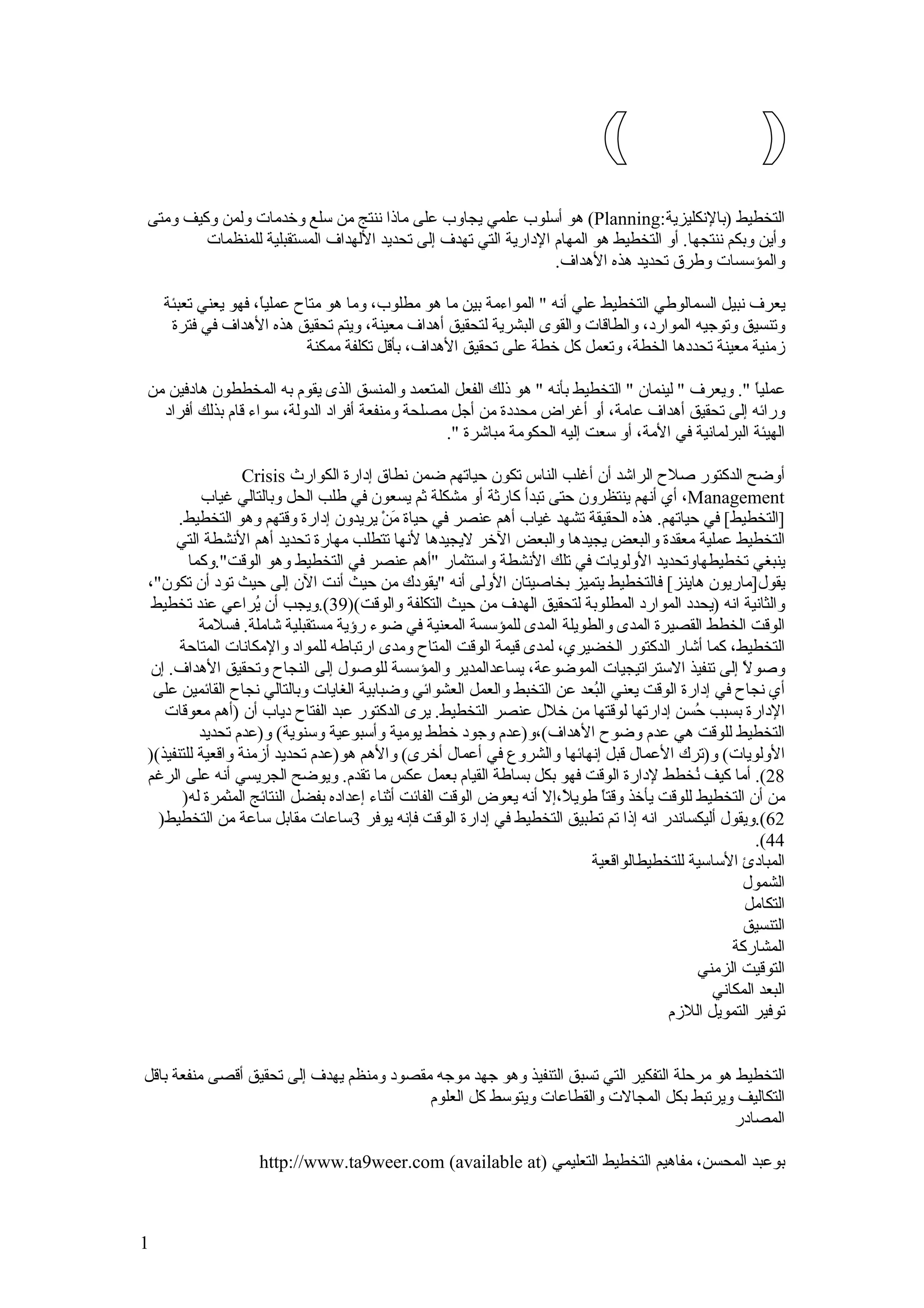 التخطيط هو عملية علمية تهدف إلى تحديد الأهداف المستقبلية للمؤسسات وطرق تحقيقها والموارد المطلوبة لذلك. يتطلب التخطيط تحديد الأولويات وإدارة الوقت بشكل فعال، ويعتبر خطوة أساسية لتجنب الفوضى وتحقيق النجاح في المؤسسات. يتضمن التخطيط العلمي تطبيق استراتيجيات للتعامل مع الأزمات والكوارث من خلال تنظيم الجهود والموارد المتاحة.