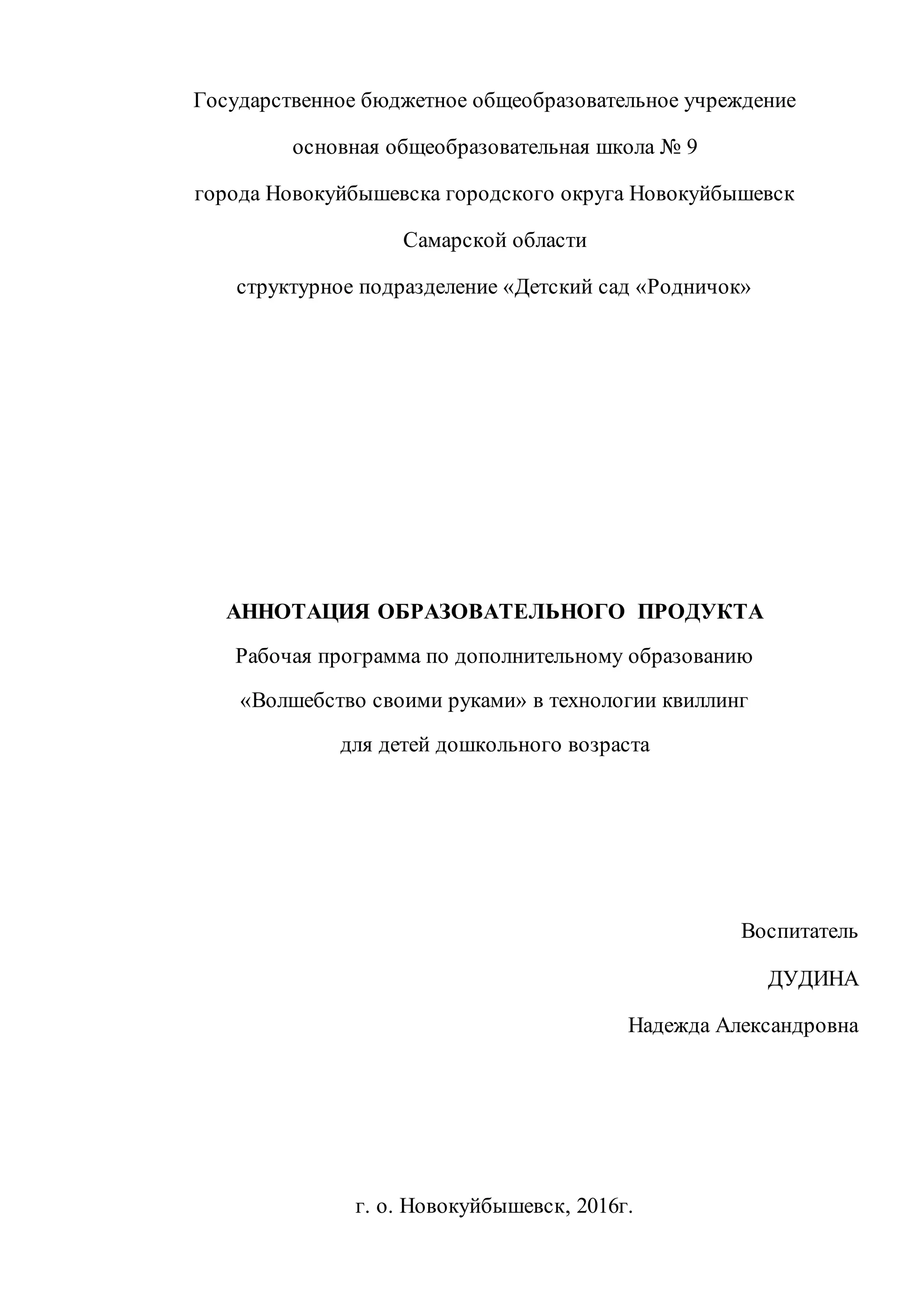 Документ представляет программу дополнительного образования 'Волшебство своими руками', ориентированную на обучение детей технике квиллинга. Программа направлена на развитие творческих способностей, мелкой моторики и художественного вкуса через занятия по изготовлению поделок из бумаги. Она включает обучающие, развивающие и воспитательные задачи и рассчитана на четырехлетний курс с занятиями для детей разных возрастных групп.