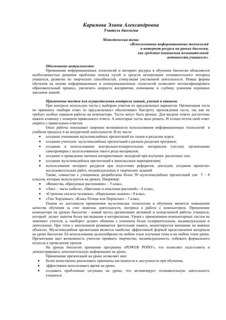 Документ описывает методическую тему использования информационных технологий и интернет-ресурсов на уроках биологии, направленную на повышение познавательной активности учащихся. Основное внимание уделяется созданию мультимедийных презентаций, тестированию и внедрению новых форм обучения, которые способствуют развитию творческих способностей учащихся. Применение мультимедийных технологий улучшает качество образования и активизирует учебный процесс, делая его более занимательным и интересным.
