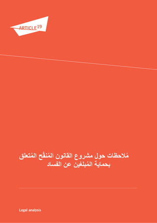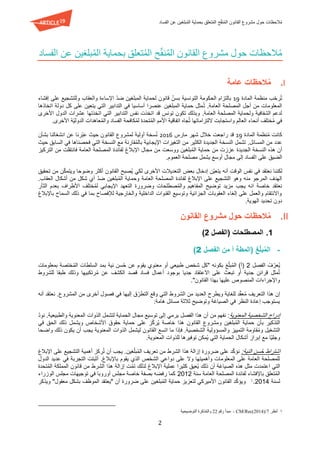 تتناول الوثيقة مشروع قانون يتعلق بحماية المبلغين عن الفساد، حيث تسعى لتعزيز الشفافية وحماية المصلحة العامة من خلال توفير تدابير قانونية للمبلغين. تتضمن الوثيقة مقترحات لتوسيع نطاق الحماية وزيادة فعالية التشريعات المُعتمدة، مع التأكيد على أهمية توضيح المصطلحات وتنفيذ العقوبات اللازمة ضد أي اعتداء على المبلغين. كما تشير الوثيقة إلى ضرورة إدارة المعلومات ومعالجة المخاوف المتعلقة بانخفاض مستوى الإبلاغ.