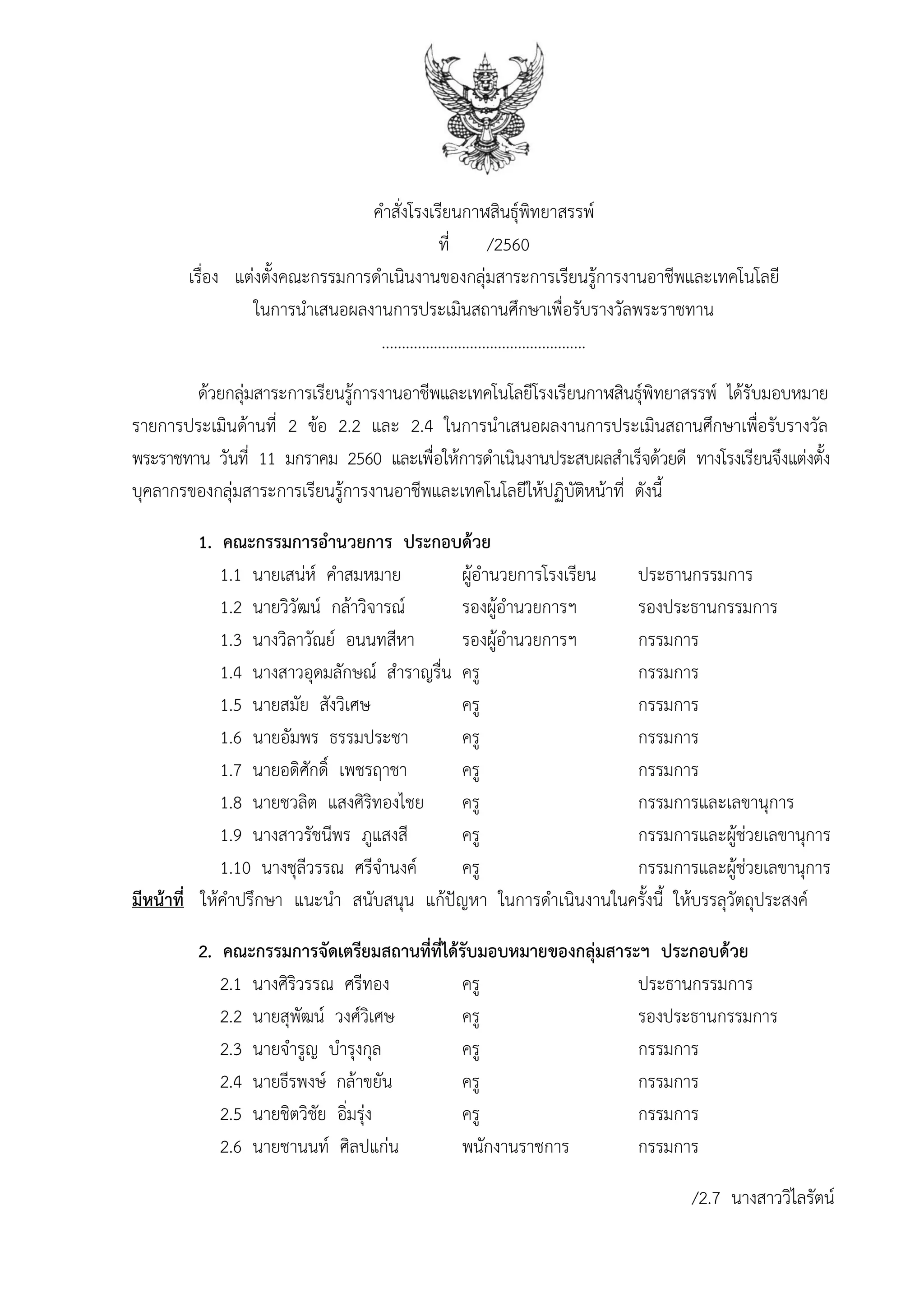 คำสั่งโรงเรียนกำฬสินธุ์พิทยำสรรพ์ ที่ /2560 เรื่อง แต่งตั้งคณะกรรมกำรดำเนินงำนของกลุ่มสำระกำรเรียนรู้กำรงำนอำชีพและเทคโนโลยี ในกำรนำเสนอผลงำนกำรประเมินสถำนศึกษำเพื่อรับรำงวัลพระรำชทำน ................................................... ด้วยกลุ่มสำระกำรเรียนรู้กำรงำนอำชีพและเทคโนโลยีโรงเรียนกำฬสินธุ์พิทยำสรรพ์
