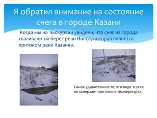 В документе рассматривается негативное влияние несанкционированных свалок снега на экологическую ситуацию в Казани. Проведенные исследования показывают наличие загрязняющих веществ в пробах снега и опасность для биоценоза рек. В частности, подчеркивается, что талый снег, загрязненный тяжелыми металлами, угрожает экосистеме и здоровье жителей.