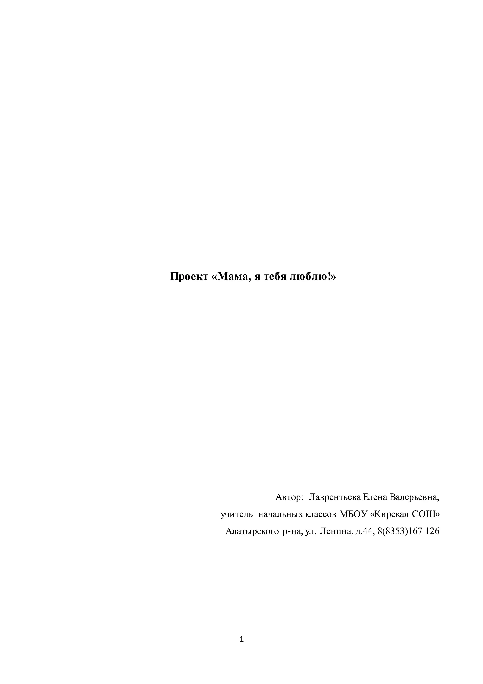 Проект «мама, я тебя люблю!» направлен на воспитание уважения и любви к матери у учащихся 3 класса MBOU «Кирская СОШ». В рамках проекта проводятся различные мероприятия, такие как выставки, творческие конкурсы и создание сайта-блога, приуроченные ко Дню матери, с целью формирования духовно-нравственных качеств и расширения знаний о традициях. Проект включает подготовительный, основной и заключительный этапы, включая беседы, чтения, рисование и музыкальные мероприятия.