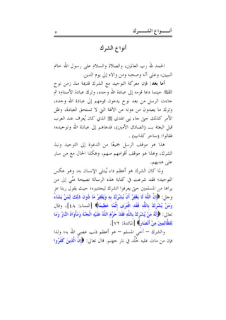 ﺃﻧــﻮﺍﻉ ﺍﻟﺸــﺮﻙ ﺃﻧﻮﺍﻉ ﺍﻟﺸﺮﻙ ﺍﳊﻤﺪ ﷲ ﺭﺏ ﺍﻟﻌﺎﳌﲔ، ﻭﺍﻟﺼﻼﺓ ﻭﺍﻟﺴﻼﻡ ﻋﻠﻰ ﺭﺳﻮﻝ ﺍﷲ ﺧﺎﰎ ﺍﻟﻨﺒﻴﲔ، ﻭﻋﻠﻰ ﺁﻟﻪ ﻭﺻﺤﺒﻪ ﻭﻣﻦ ﻭﺍﻻﻩ ﺇﱃ ﻳﻮﻡ ﺍﻟﺪﻳﻦ. ﺃﻣﺎ ﺑﻌﺪ: ﻓﺈﻥ ﻣﻌﺮﻛﺔ ﺍﻟﺘﻮﺣﻴﺪ ﻣﻊ ﺍﻟﺸﺮﻙ ﻗﺪﳝﺔ ﻣﻨﺬ ﺯﻣﻦ ﻧﻮﺡ ﺣﻴﻨﻤﺎ ﺩﻋﺎ ﻗﻮﻣﻪ ﺇﱃ ﻋﺒﺎﺩﺓ ﺍﷲ ﻭﺣﺪﻩ، ﻭﺗﺮﻙ ﻋﺒﺎﺩﺓ ﺍﻷﺻﻨﺎﻡ؛ ﰒ ﺟﺎﺀﺕ ﺍﻟﺮﺳﻞ ﻣﻦ ﺑﻌﺪ ﻧﻮﺡ ﻳﺪﻋﻮﻥ ﻗﻮﻣﻬﻢ ﺇﱃ ﻋﺒﺎﺩﺓ ﺍﷲ ﻭﺣﺪﻩ، ﻭﺗﺮﻙ ﻣﺎ ﻳﻌﺒﺪﻭﻥ ﻣﻦ ﺩﻭﻧﻪ ﻣﻦ ﺍﻵﳍﺔ ﺍﻟﱵ ﻻ ﺗﺴﺘﺤﻖ ﺍﻟﻌﺒﺎﺩﺓ، ﻭﻇﻞ ﺍﻷﻣﺮ ﻛﺬﻟﻚ ﺣﱴ ﺟﺎﺀ ﻧﱯ ﺍﳍﺪﻯ ﺍﻟﺬﻱ ﻛﺎﻥ ُﻌﺮﻑ ﻋﻨﺪ ﺍﻟﻌﺮﺏ ﻳ ﻗﺒﻞ ﺍﻟﺒﻌﺜﺔ ﺑـ )ﺍﻟﺼﺎﺩﻕ ﺍﻷﻣﲔ(، ﻓﺪﻋﺎﻫﻢ ﺇﱃ ﻋﺒﺎﺩﺓ ﺍﷲ ﻭﺗﻮﺣﻴﺪﻩ؛ ﻓﻘﺎﻟﻮﺍ: )ﺳﺎﺣﺮ ﻛﺬﺍﺏ( . ﻫﺬﺍ ﻫﻮ ﻣﻮﻗﻒ ﺍﻟﺮﺳﻞ ﲨﻴﻌًﺎ ﻣﻦ ﺍﻟﺪﻋﻮﺓ ﺇﱃ ﺍﻟﺘﻮﺣﻴﺪ ﻭﻧﺒﺬ ﺍﻟﺸﺮﻙ، ﻭﻫﺬﺍ ﻫﻮ ﻣﻮﻗﻒ ﺃﻗﻮﺍﻣﻬﻢ ﻣﻨﻬﻢ، ﻭﻫﻜﺬﺍ ﺍﳊﺎﻝ ﻣﻊ ﻣﻦ ﺳﺎﺭ ﻋﻠﻰ ﻫﺪﻳﻬﻢ. ﻭﳌﺎ ﻛﺎﻥ ﺍﻟﺸﺮﻙ ﻫﻮ ﺃﻋﻈﻢ ﺩﺍﺀ ُﺒﺘﻠﻰ ﺍﻹﻧﺴﺎﻥ ﺑﻪ، ﻭﻫﻮ ﻋﻜﺲ ﻳ ﺍﻟﺘﻮﺣﻴﺪ؛ ﻓﻘﺪ ﺷﺮﻋﺖ ﰲ ﻛﺘﺎﺑﺔ ﻫﺬﻩ ﺍﻟﺮﺳﺎﻟﺔ ﻧﺼﻴﺤﺔ ﻣﱢﻲ ﺇﱃ ﻣﻦ ﻨ ﻳﺮﺍﻫﺎ ﻣﻦ ﺍﳌﺴﻠﻤﲔ ﺣﱴ ﻳﻌﺮﻓﻮﺍ ﺍﻟﺸﺮﻙ ﻟﻴﺠﺘﻨﺒﻮﻩ؛ ﺣﻴﺚ ﻳﻘﻮﻝ ﺭﺑﻨﺎ ﻋﺰ ﻭﺟﻞ: ﹺﺇ ﱠ ﺍﻟ ﱠﻪ ﻟﹶﺎ َﻳﻐﻔ ُ ﹶﺃﻥ ُﺸﺮﻙ ﹺﺑﻪ ﻭَﻳﻐﻔﺮُ ﻣَﺎ ُﻭﻥ ﺫِﻟﻚ ِﻟﻤﻦ َﻳﺸَﺎﺀ ﻥ ﻠ َ ْ ِﺮ ﹾ ﻳ ْ َ َ ِ َ ْ ِ ﺩ ﹶ ﹶ َ َ ْ ُ ﻭﻣﻦ ُﻳﺸﺮﻙ ﺑﹺﺎﻟﻠﱠﻪ ﻓﻘﺪ ﺍﻓَﺘﺮَﻯ ﹺﺇﹾﺛﻤًﺎ ﻋﻈِﻴﻤًﺎ] ﺍﻟﻨﺴﺎﺀ: ٨٤[، ﻭﻗﺎﻝ َ ََ ْ ْ ﹺ ْ ِ ﹶﹶ ِ ﹾ ﺗﻌﺎﱃ: ﹺﺇﱠ ُ ﻣﻦ ُﻳﺸﺮﻙ ﺑﹺﺎﻟ ﱠﻪ ﻓﻘﺪ ﺣ ﱠﻡ ﺍﻟ ﱠﻪ ﻋﻠﻴﻪ ﺍﹾﻟﺠﱠﺔ ﻭﻣﺄﻭَﺍﻩ ﺍﻟﱠﺎﺭ ﻭﻣَﺎ ﻧﻪ َ ْ ْ ﹺ ْ ﻠ ِ ﹶ ﹶ ْ َﺮ َ ﻠ ُ َ ﹶ ْ ِ َﻨ ﹶ َ َ ﹾ ُ ﻨ ُ َ ﻟِﻠﻈﱠﺎِﻟﻤﲔ ﻣﻦ ﹶﺃْﻧﺼَﺎﺭ] ﺍﳌﺎﺋﺪﺓ: ٢٧[. ﹴ َِِْ ﻭﺍﻟﺸﺮﻙ – ﺃﺧﻲ ﺍﳌﺴﻠﻢ – ﻫﻮ ﺃﻋﻈﻢ ﺫﻧﺐ ﻋﺼﻲ ﺍﷲ ﺑﻪ؛ ﻭﻟﺬﺍ ﻓﺈﻥ ﻣﻦ ﻣﺎﺕ ﻋﻠﻴﻪ ﺧﱢﺪ ﰲ ﻧﺎﺭ ﺟﻬﻨﻢ. ﻗﺎﻝ ﺗﻌﺎﱃ: ﹺﺇ ﱠ ﺍﱠﺬِﻳﻦ ﻛﻔ ُﻭﺍ ﻥ ﻟ َ ﹶ ﹶﺮ ُﻠ