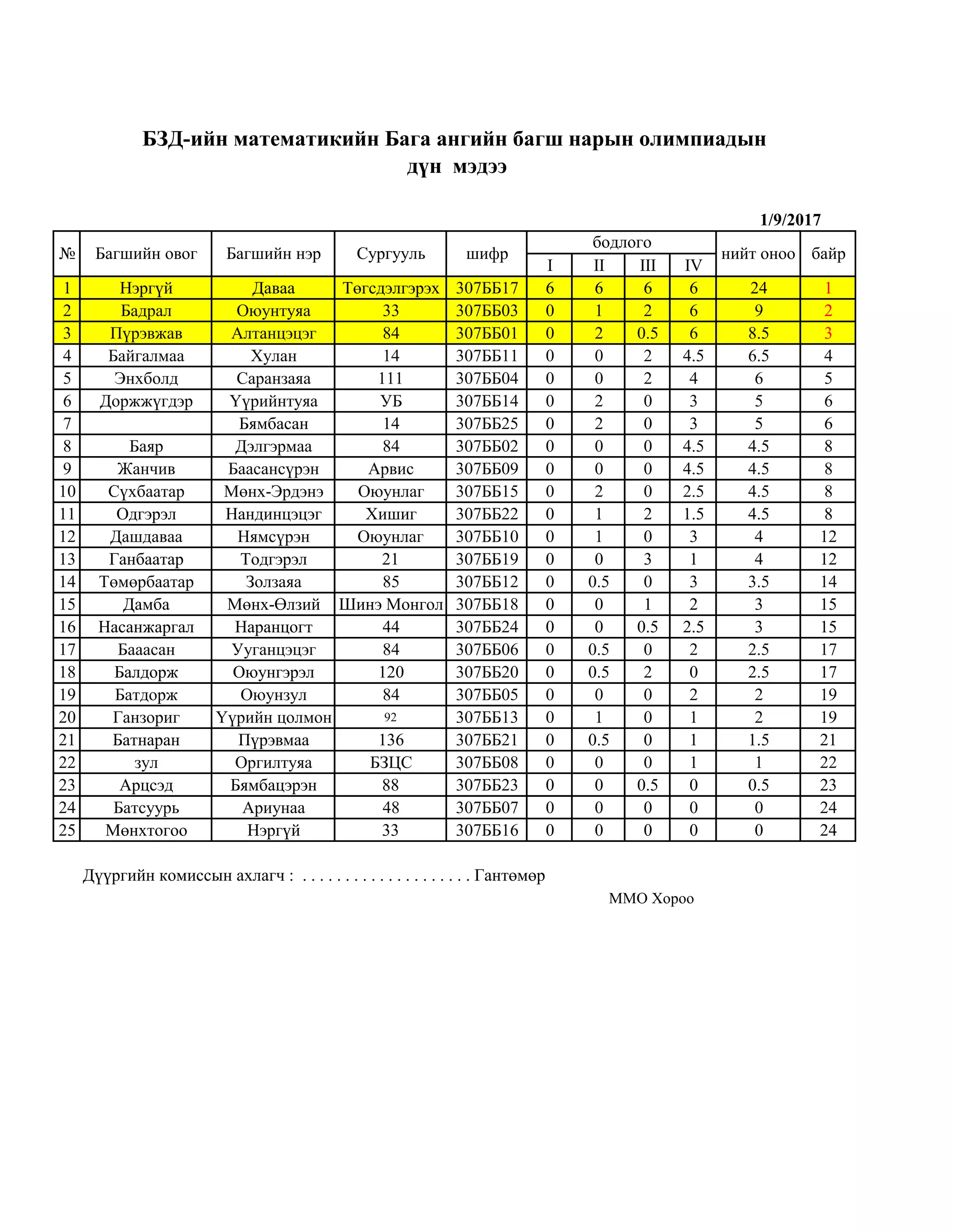IV 1 Нэргүй Даваа Төгсдэлгэрэх 307ББ17 6 6 6 6 24 1 2 Бадрал Оюунтуяа 33 307ББ03 0 1 2 6 9 2 3 Пүрэвжав Алтанцэцэг 84 307ББ01 0 2 0.5 6 8.5 3 4 Байгалмаа Хулан 14 307ББ11 0 0 2 4.5 6.5 4 5 Энхболд Саранзаяа 111 307ББ04 0 0 2 4 6 5 6 Доржжүгдэр Үүрийнтуяа УБ 307ББ14 0 2 0 3 5 6 7 Бямбасан 14 307ББ25 0 2 0 3 5 6 8 Баяр Дэлгэрмаа 84 307ББ02 0 0 0 4.5 4.5 8 9 Жанчив Баасансүрэн Арвис 307ББ09 0 0 0 4.5 4.5 8 10 Сүхбаатар Мөнх-Эрдэнэ Оюунлаг 307ББ15 0 2 0 2.5 4.5 8 11 Одгэрэл Нандинцэцэг Хишиг 307ББ22 0 1 2 1.5 4.5 8 12 Дашдаваа Нямсүрэн Оюунлаг 307ББ10 0 1 0 3 4 12 13 Ганбаатар Тодгэрэл 21 307ББ19 0 0 3 1 4 12 14 Төмөрбаатар Золзаяа 85 307ББ12 0 0.5 0 3 3.5 14 15 Дамба Мөнх-Өлзий Шинэ Монгол 307ББ18 0 0 1 2 3 15 16 Насанжаргал Наранцогт 44 307ББ24 0 0 0.5 2.5 3 15 17 Бааасан Ууганцэцэг 84 307ББ06 0 0.5 0 2 2.5 17 18 Балдорж Оюунгэрэл 120 307ББ20 0 0.5 2 0 2.5 17 19 Батдорж Оюунзул 84 307ББ05 0 0 0 2 2 19 20 Ганзориг Үүрийн цолмон 92 307ББ13 0 1 0 1 2 19 21 Батнаран Пүрэвмаа 136 307ББ21 0 0.5 0 1 1.5 21 22 зул Оргилтуяа БЗЦС 307ББ08 0 0 0 1 1 22 23 Арцсэд Бямбацэрэн 88 307ББ23 0 0 0.5 0 0.5 23 24 Батсуурь Ариунаа 48 307ББ07 0 0 0 0 0 24 25 Мөнхтогоо Нэргүй 33 307ББ16 0 0 0 0 0 24 Дүүргийн комиссын ахлагч : . . . . . . . . . . . . . . . . . . . . Гантөмөр БЗД-ийн математикийн Бага ангийн багш нарын олимпиадын дүн мэдээ нийт оноо байр 1/9/2017 ММО Хороо № Багшийн овог Багшийн нэр Сургууль шифр бодлого