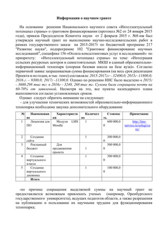 Документ описывает исполнение научного гранта на проект по интеграции сельских ресурсных центров в образовательно-информационный технопарк, утвержденного на 2015-2017 годы. Финансирование было значительно сокращено на 60-70% от запрашиваемой суммы, что повлияло на возможности проведения международных командировок и публикаций научных работ. Несмотря на ограничения, работа по проекту продолжается, однако часть мероприятий придется проводить в онлайн-формате.