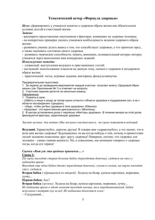 Тематический вечер «Формула здоровья» направлен на формирование у школьников понятий о здоровом образе жизни и его значении для долгой и счастливой жизни. В программе мероприятия предусмотрены выступления, сценки, викторины и физкультминутки, которые помогут развить умение оценивать факторы, влияющие на здоровье. Участников делят на команды, и в ходе конкурсов они зарабатывают жетоны, что делает процесс обучения увлекательным и интерактивным.
