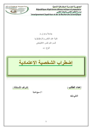 تناقش الوثيقة اضطراب الشخصية الاعتمادية، الذي يتسم بحاجة مفرطة للاعتماد على الآخرين لتلبية الاحتياجات اليومية، ويظهر من خلال القلق والخوف من الانفصال. كما تُوضح الأسباب المحتملة للإصابة بهذا الاضطراب، بما في ذلك العوامل البيئية والنفسية. يستعرض النص المعايير التشخيصية وفقًا لدليل DSM-IV.