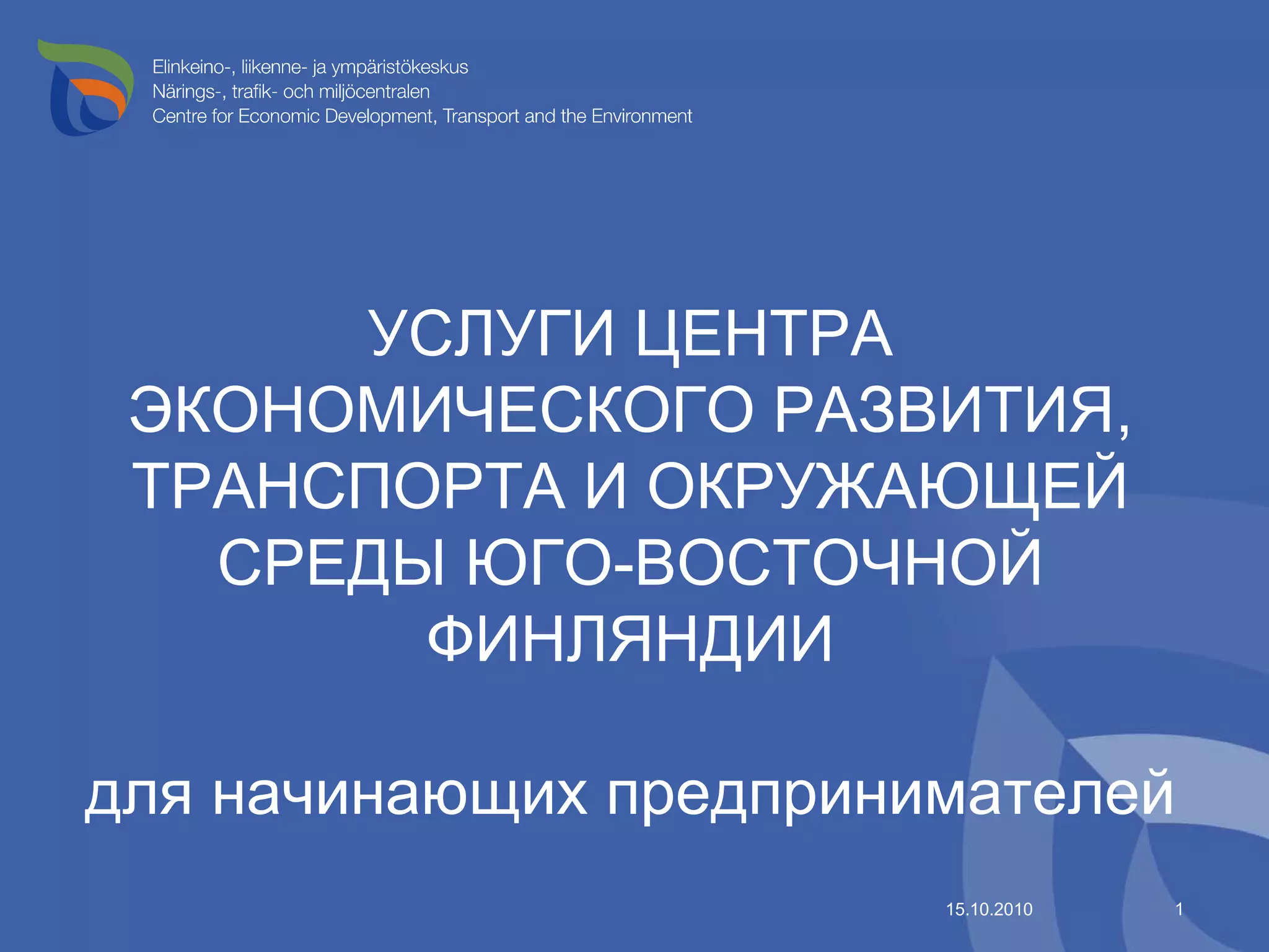 Документ описывает услуги центра экономического развития, транспорта и окружающей среды Юго-Восточной Финляндии для начинающих предпринимателей, включая консультации, регистрацию, курсы и финансовую поддержку. Он также предоставляет информацию о различных пакетах услуг, программам по разработке бизнес-планов, патентованию и финансированию на старте бизнеса. В дополнение к этому, указаны условия получения стартового пособия и требования к предпринимателям.