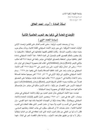 الكوفة قسم(املرحل يخرالتا)ابعةرال ة املادة:اتركياوتر انراي يخ استاذ.أ.م.د : المادةالعالق احمد الثانية العالمية الحرب بعد تركيا في العامة األوضاع ) احلزيب التعدد (سياسة ػعػػلاالو ػتػػمىات ف ػػػاكام ػعػػمى ػالـػػعال ػـػػتك ا ػعػػاز ا ػاػػاااتاو ػابػػزال ػعتػػ و اف ػاػػمو ػابز ػالـعم ت ػداو ػةاي ا ال ػةمالكا ػوفيااتال ػادزاالا ىـػتا ف ػز ػف ا يكيةااالم المازدة الياتوال فاى دة جدػام ت ػوفتفال ا ػةكط الم ػف ػاماطمعااه هما كما ف لمكاما ت وكا . )الباادة (الزاب ػب ت ػادةىبا ػوفيااتال ػادزاالا ػدبف . ػةةالداف ػايالم الع بالوصوؿ الكديـ يالكيصا بالزكـ فيزممو اوالت ػباػ ػػف ػاػطيال ػااماػم ػػف ػةػيالااك ف ػاػ بالم ػةػكالماعم ااو ػوػم ػةػيبااقاة ػاػظ ال5491طا ػاػمكػبػل ( ةااص ا الوبKars( ااداافو )Ardahanػاـى افاػ ا ػف ػافج اااب ػةياجمهو ػاـية اىكاب ف ) 5491ػػف ػواػزالم دوؿ ػعػمى ػابػزال ػاػيااك ػيفػىا ػاػ ا ػعػموى .32ػباػ5491ػادػزاالا ػدـػة ػاـػى ػاػهوةع ػػاال ػادػيالزو ػداةةػصال ػةػيااقاة ػاصػةال ػعػمى ػدػزاو ػبػ جا ػفػم ػوفيااػتال5431ػمـػتو . ال االازادف االولع ااكيا الع ف اامبك توفياا54آباا5491ػداةةصال معاادة بموجبها الةع ػػف ػةػي ا الو ػداصػااالى ػدـػىو7افاػػيتز5491ف ػاػ الم ػعػمى ػوفياايةػت ػدػىاوة ػاصػ با ػاػه ف ػبػلطا ( ػااصػػة ةيةاػػػ ال ػاليـػػةاال ػودةػػعب ػالػػامطالب ػفػػى نيػػػ فKars( ػافػػااادو )Ardahanػجػػ ػاػػمك ) ػػمى ػفػماالا ت ػوفػتالػكوػتتي ااف ػافػت ػااماػم ػعػلا ةاػبكػم ػفػماالا ػدـػة ب ا ػاػيااك ػفػى ػاؿػصق اال ع . التوفيااية يا اام يةاجمهو الع الااكية يا اام ـ ها ف اوطالب ػاامام ػف ػوفيااتال االازادو ااكيا ف ب الزدود ل اعد أف ب التوفياا االازاد دىوة اجددت ػوتما ف ىكد البي . بواتداـ–آب5491ػادزاالاو ػدةزالما ػاتيالو(ال اػابالك ػدوؿلا ػوا وبز افو ا ػومكال ها ام اهدد باات الخااجية دات الاهد اف ااكيا وجدت واكبا . )يا يطااوا التوفياا ػابػػزال ػػػف ػاصػػقالزم ػالػػكزك ػبيػػلا ػاػػص ال ػلػػمىا اف ػيماػػت الو ػابػػةال ود ػبػػتك ػعػػلا ػعػػتال ػاػػه ىم ال اف اال ػاؼػ م ػلػمىا ا ػةػي ا ال ػةػيالعالم. ػػتالتيا ػامهـػظ و ػاصػقالزم ػبػ جا ػعػلا فػيكوػت ػاكبلػتم ػايايطالو ػاي الما ػفم ػلك ػف اخقاةال بت ا البي ازدوال الزتب ظاـ ىف الاخم مف لها بد ال فكاف ػامفه ا البيد ف الزا االةاصاد ظاـ اىة او ا ابتاالز اعدد ظاـ ف اطب مف لها بد ال وكاف ا