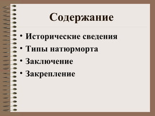 Документ описывает значение слова 'натюрморт', которое в переводе с французского означает 'мертвая натура', и объясняет это как жанр изобразительного искусства, где изображаются предметы быта, цветы и другие вещи. Выделяются два основных типа натюрморта: один, где вещи отображают своего владельца, и другой, где вещи важны сами по себе. Обсуждаются истоки жанра, его развитие в различные исторические эпохи, а также взаимосвязь между объектами и человеческим восприятием.
