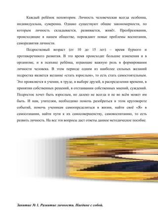 Документ представляет собой методическое пособие для учителей химии, содержащее разработанные занятия по развитию личности подростков. В нем рассматриваются важные аспекты самоопределения, саморазвития и патриотизма, а также акцентируется внимание на необходимости помощи подросткам в их стремлении стать самостоятельными. Каждое занятие включает темы, такие как самовоспитание, понимание людей и выбор профессии, с практическими заданиями для учащихся.