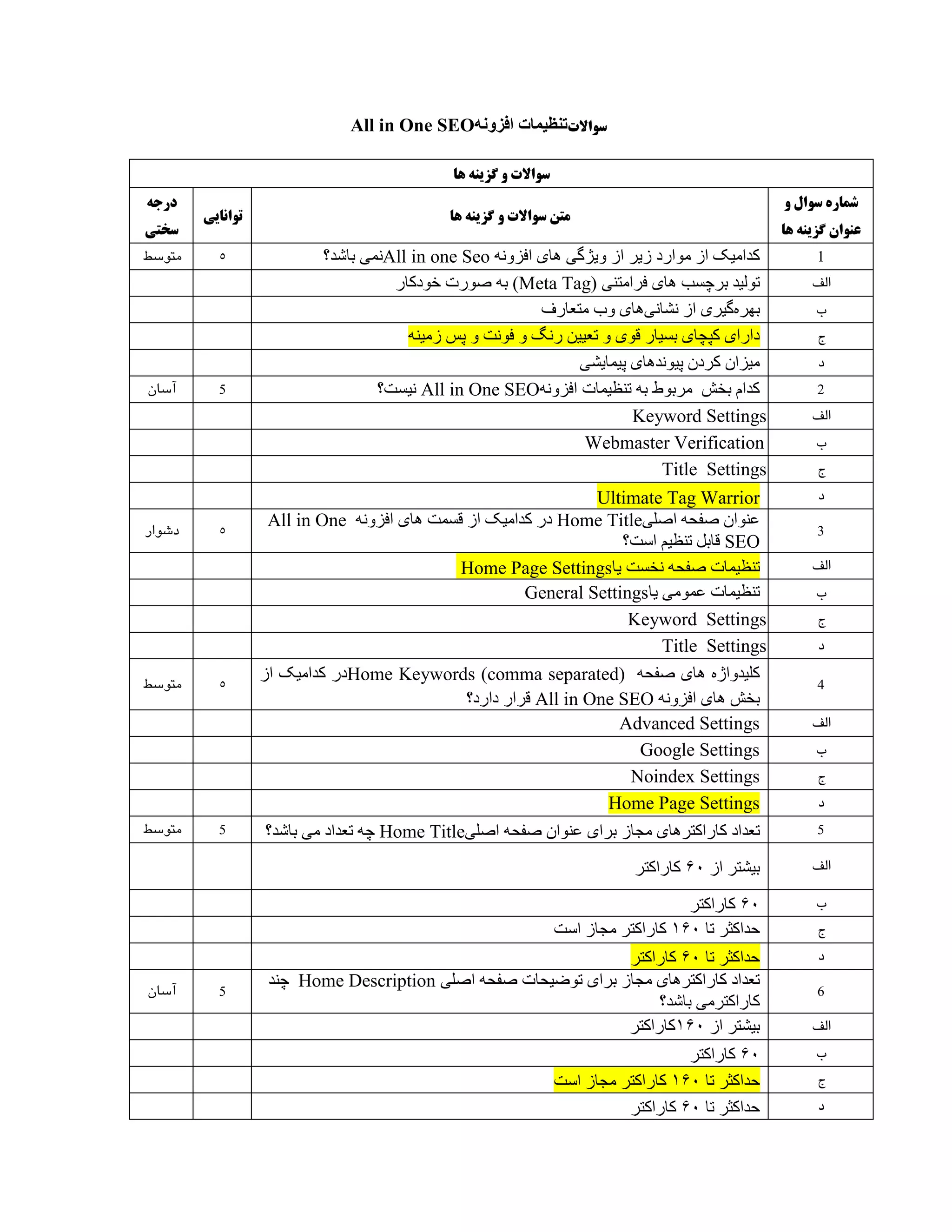 One SEO ها گزینه و سواالت و سوال شماره ها گزینه عنوان ها گزینه و سواالت متنتوانایی درجه سختی 1افزونه های ویژگی از زیر موارد از کدامیکAll in one Seoباشد؟ نمی5متوسط الففرامتنی های برچسب تولید(Meta Tag)خودکار صورت به ببهرهنشانی از گیریمتعارف وب های جزمینه پس و فونت و رنگ تعیین و قوی بسیار کپچای دارای دپیمایشی پیوندهای کردن میزان 2افزونه تنظیمات به مربوط بخش کدامAll in One SEOنیست؟5آسان الفKeyword Settings gs بWebmaster Verification on جTitle Settings gs دUltimate Tag Warrior 3 اصلی صفحه عنوانHome Titleافزونه های قسمت از کدامیک درAll in One SEOاست؟ تنظیم قابل 5دشوار الفتنظیماتصفحهنخستیاSettingsPageHome بتنظیماتعمومییاSettingsGeneral جKeyword Settings gs دTitle Settings gs 4 صفحه های کلیدواژهHome Keywords (comma separated)از کدامیک در افزونه های بخشAll in One SEOدارد؟ قرار 5متوسط الف1.Advanced Settings ب2.Google Settings ج3.Noindex Settings دSettingsPageHome 5مجاز کاراکترهای تعداداصلی صفحه عنوان برایHome Titleباشد؟ می تعداد چه5متوسط الفاز بیشتر۰۶کاراکتر ب۰۶کاراکتر جتا حداکثر1۰۶است مجاز کاراکتر دتا حداکثر۰۶کاراکتر 6 اصلی صفحه توضیحات برای مجاز کاراکترهای تعدادHome Descriptionچند باشد؟ کاراکترمی 5آسان الفاز بیشتر1۰۶کاراکتر ب۰۶کاراکتر جتا حداکثر1۰۶است مجاز کاراکتر دتا حداکثر۰۶کاراکتر