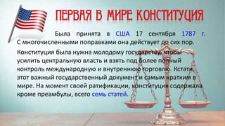 Документ предоставляет подробный анализ Конституции Российской Федерации, определяя ее как основной закон государства, который регулирует политическую и правовую систему, а также права и свободы граждан. Он описывает структуру Конституции, отмечает ключевые изменения и поправки, принятые с момента её принятия, и упоминает о символическом значении Конституции для президентской власти. Также упоминается о создании электронного музея, целью которого является сохранение исторического наследия российского конституционализма.