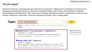 Документ описывает стратегию контекстной рекламы для автосервиса, направленную на предугадывание потребностей клиентов, что позволяет эффективно привлекать лояльных пользователей. Для успешной реализации такой рекламы требуется систематическая работа над воронкой продаж, включая создание интересного контента и ретаргетинг. Несмотря на высокую сложность и временные затраты, такая реклама приносит адекватных клиентов по низкой цене.