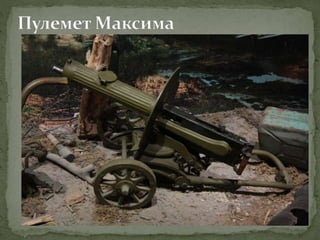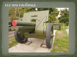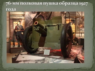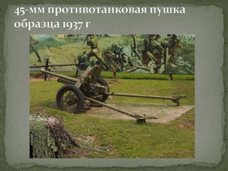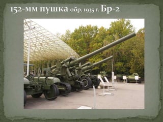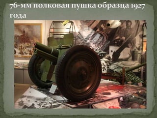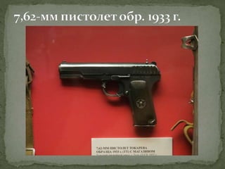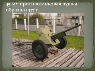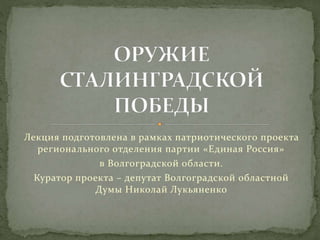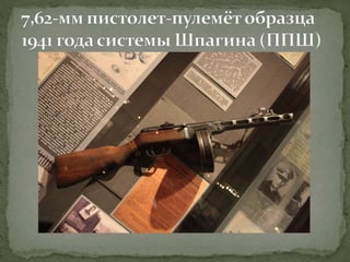 Документ представляет собой лекцию, посвященную различным образцам советского оружия, использовавшегося в Великой Отечественной войне, включая пистолеты, пулеметы, артиллерийские орудия и танки. Подробно рассматриваются характеристики и историческое применение каждого типа оружия, а также их разработка и модернизация. Особое внимание уделяется ролям этих орудий в ключевых сражениях, таких как Сталинградская битва.
