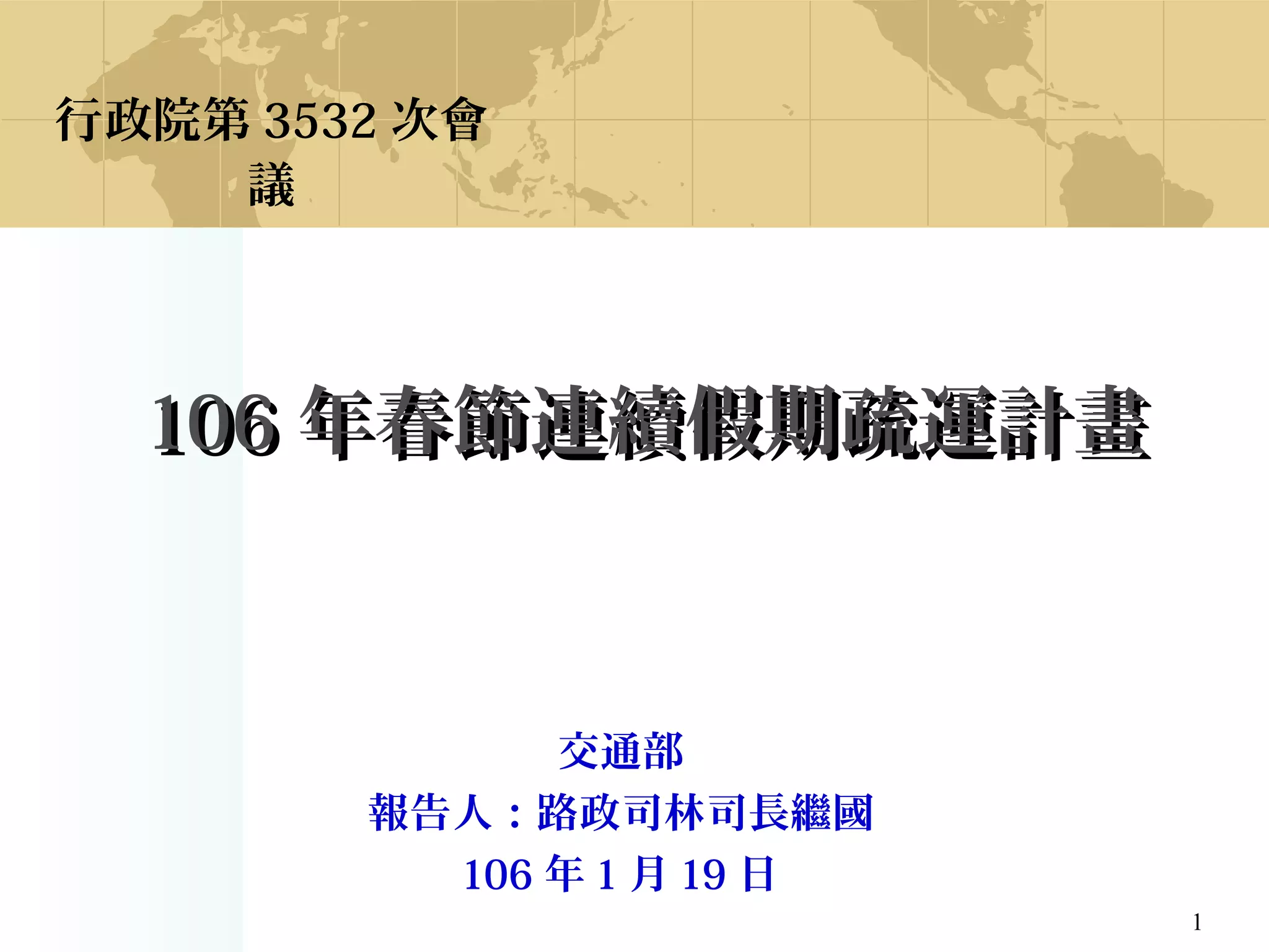 本文件为106年春节假期交通疏运计划,涵盖了假期特性、高速公路管制、公共运输运能规划及疏运措施等内容。假期自1月27日至2月1日,共6天,预计交通繁忙,特别是在节假日的集中出行高峰期。为缓解交通拥堵,设定了多项管制和增运措施,包括高速公路限行、加开班次的公共交通和热门景点的接驳服务。