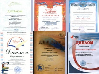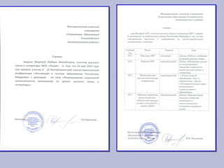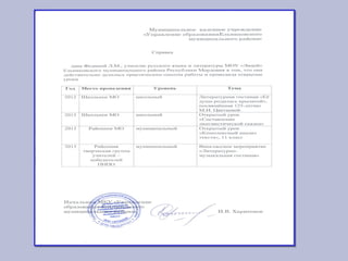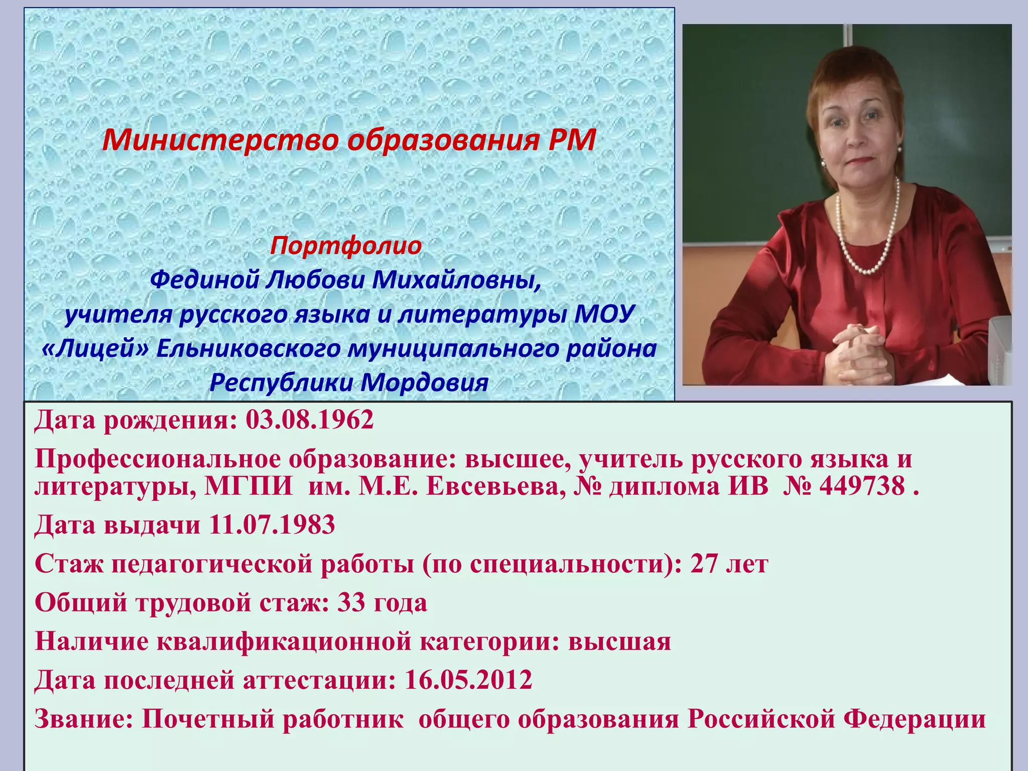 Документ представляет портфолио Фединой Любови Михайловны, учителя русского языка и литературы с 27-летним стажем, подтвержденным высшей квалификационной категорией. В нем отмечены достижения ее обучающихся на различных уровнях конкурсов, а также активное участие в научных и методических мероприятиях. Также указаны данные о повышении квалификации и наличии публикаций.