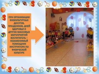 Документ описывает роль воспитателя в организации физкультурно-оздоровительной работы в детском саду, акцентируя внимание на совместной деятельности с инструктором по физической культуре. Важными элементами являются утренняя гимнастика, подвижные игры и спортивные упражнения, а также активное участие воспитателя в обучении и дисциплине детей. Эффективность работы зависит от взаимодействия педагогов и подготовки к занятиям.