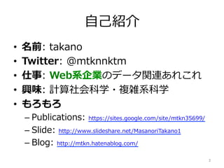Twitter: @mtknnktm • 仕事: Web系企業のデータ関連あれこれ • 興味: 計算社会科学・複雑系科学 • もろもろ – Publications: https://sites.google.com/site/mtkn35699/ – Slide: http://www.slideshare.net/MasanoriTakano1 – Blog: http://mtkn.hatenablog.com/ 2