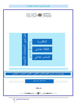 تستعرض الوثيقة دليل امتحانات الشهادة الباكلوريا للعام 2016، موضحةً الإجراءات والتدابير الخاصة بمختلف المتدخلين في الامتحانات. تشمل المعلومات المقررات الدراسية، المهام الموكلة، والموارد المتاحة لضمان سير عملية الامتحانات بالشكل الأمثل. تعتبر هذه الوثيقة مرجعاً أساسياً للمعلمين والمديرين وطلبة الباكلوريا.
