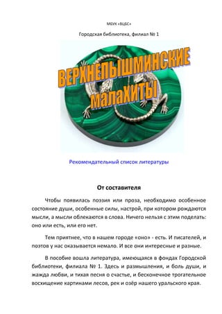 Документ представляет собой рекомендательный список литературы, включающий произведения местных авторов, таких как поэты и прозаики из Верхней Пышмы и Екатеринбурга. В нём описываются разные жанры, темы и особенности книг, что позволяет читателям выбирать произведения по своему вкусу и интересам. Кратко освещаются основные идеи и содержимое произведений, которые отражают душевные переживания, любовь и культурные особенности региона.