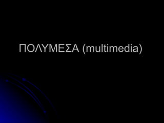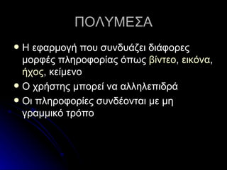 ΠΟΛΥΜΕΣΑ Η εφαρμογήπου συνδυάζει διάφορες μορφές πληροφορίας όπως βίντεο , εικόνα , ήχος , κείμενο Ο χρήστης μπορεί να αλληλεπιδρά Οι πληροφορίες συνδέονται με μη γραμμικό τρόπο