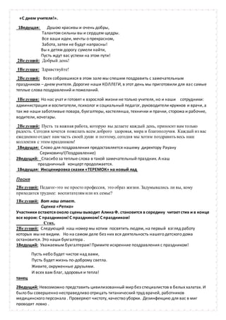 Документ содержит сценарий поздравительной программы, посвященной Дню учителя, в детском доме. В ходе мероприятия сотрудники и воспитанники выражают благодарность и уважение учителям, сотрудникам, медицинскому и обслуживающему персоналу. Программа включает поздравления, праздничные номера и сценки, подчеркивающие важность каждого участника в воспитании и жизни детей.