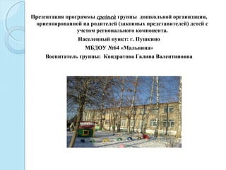 Презентация программы для средней группы дошкольного учреждения в Пушкино описывает цели и задачи, направленные на всестороннее развитие детей 4-5 лет, включая познавательную, социально-коммуникативную и физическую активность. В документе подчеркивается важность создания благоприятной образовательной среды и сотрудничества с семьями, а также организация образовательного процесса с учетом региональных особенностей. Программа охватывает различные аспекты детского развития и включает многообразные формы взаимодействия с родителями.
