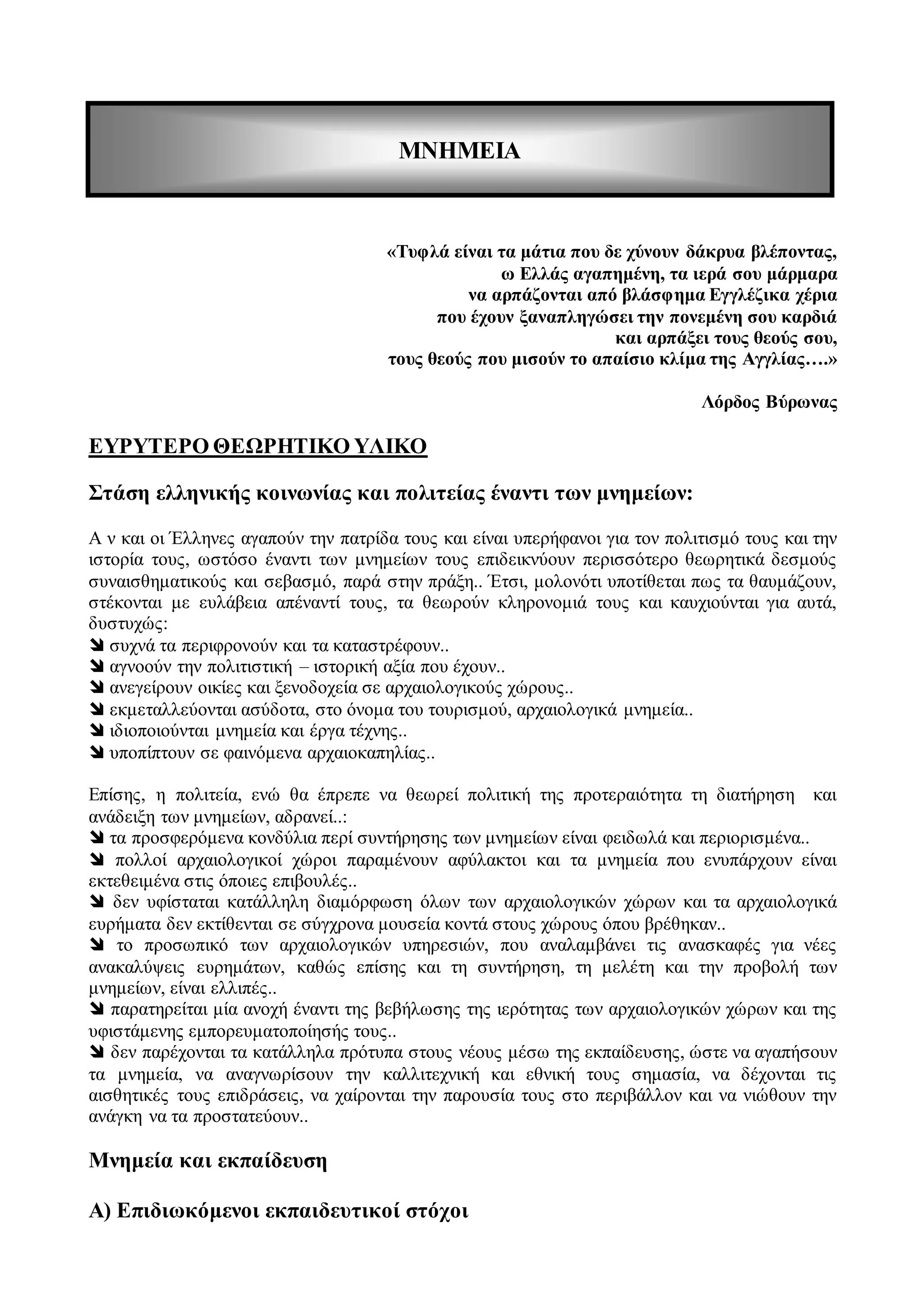 σύνδεση των μνημείων με τη διδασκαλία μαθημάτων, όπως είναι η ιστορία, τα θρησκευτικά, η