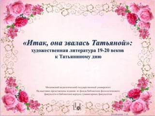 Выставка, организованная Московским педагогическим государственным университетом, посвящена произведениям художественной литературы XIX-XX веков, связанным с именем Татьяна к Татьяниному дню, который также отмечается как День российского студенчества. В экспозиции представлены разнообразные литературные произведения, включая стихи, пьесы и романы, в которых главные героини носят имя Татьяна. Цель выставки - познакомить читателей с отмечаемой датой и богатым литературным наследием.