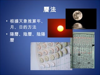 曆法 根據天象推算年、月、日的方法 陽曆、陰曆、陰陽曆