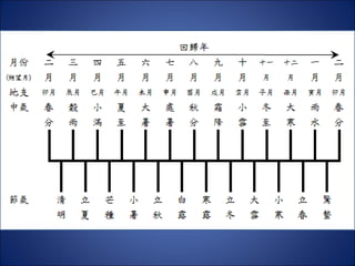 文档讨论了天文历法,包括阳历、阴历和阴阳历的定义和历史。它介绍了天干地支的起源、五行与阴阳的关系,以及二十四节气的形成和重要性。最后,阐述了节气在中国文化中的社交和农业实践中的作用。