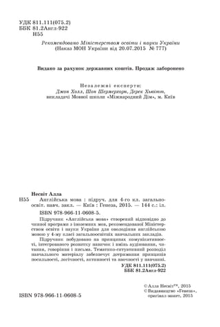 This document is the introduction to an English language textbook for 4th grade students in Ukraine. It provides background information on the textbook, describing its communicative approach and topic-based structure. It also outlines the textbook's content, focusing on familiar characters and introducing a new British family, the Parkers. The introduction explains how the textbook aims to develop students' language skills while increasing their cultural awareness.