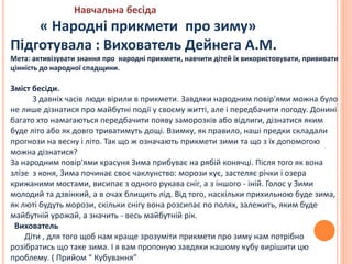 Мета: активізувати знання про народні прикмети, навчити дітей їх використовувати, прививати