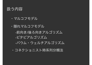 マルコフモデル,隠れマルコフモデルとコネクショニスト時系列分類法 1. 2. 3. 4. 5. 6. 7. 8. 9. 10. 11. パラメータの最尤推定