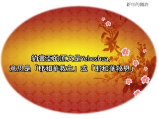 新年的期許 約書亞的原文是Yehoshua, 意思是「耶和華救主」或「耶和華救恩」