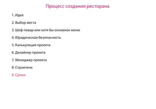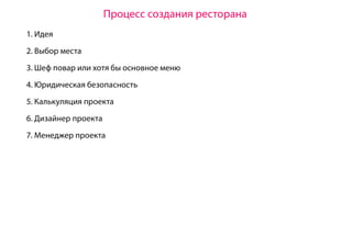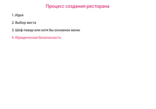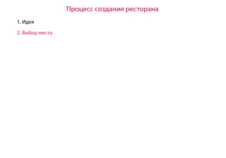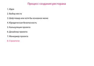 Документ представляет собой список различных ресторанов и заведений, приведенных с указанием года их открытия или актуального статуса. Каждое упомянутое заведение связано с определенной географической локацией. Информация охватывает разнообразные кулинарные направления и временные рамки.