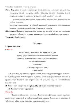 Мета. Формувати в учнів уявлення про різноманітність рослинного світу: мохи,