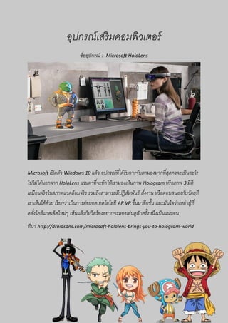 HoloLens Microsoft เปิดตัว Windows 10 แล้ว อุปกรณ์ที่ได้รับการจับตามองมากที่สุดคงจะเป็นอะไร ไปไม่ได้นอกจาก HoloLens แว่นตาที่จะทาให้เรามองเห็นภาพ Hologram หรือภาพ 3 มิติ เสมือนจริงในสภาพแวดล้อมจริง รวมถึงสามารถมีปฎิสัมพันธ์ สั่งงาน หรือตอบสนองกับวัตถุที่ เราเห็นได้ด้วย เรียกว่าเป็นการต่อยอดเทคโลโลยี AR VR ขึ้นมาอีกขั้น และมั่นใจว่าเหล่าผู้ที่ คลั่งไคล้แกดเจ็ดใหม่ๆ เห็นแล้วก็หวีดร้องอยากจะลองเล่นดูสักครั้งหนึ่งเป็นแน่นอน ที่มา http://droidsans.com/microsoft-hololens-brings-you-to-hologram-world