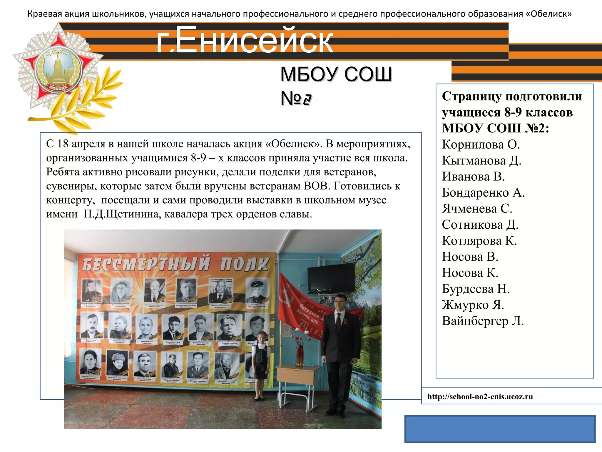 В школе МБОУ СОШ No2 с 18 апреля проходит акция «Обелиск», в рамках которой ученики 8-9 классов участвуют в различных мероприятиях, включая создание сувениров для ветеранов и организацию выставок. С 25 апреля по 15 мая проводятся выставки и концерты, посвященные памяти павших героев, а ученики также проводят субботники на местах захоронения. Важным элементом акции является фотовыставка «Никто не забыт...», на которой школьники делятся фотографиями своих родственников, принимавших участие в Великой Отечественной войне.