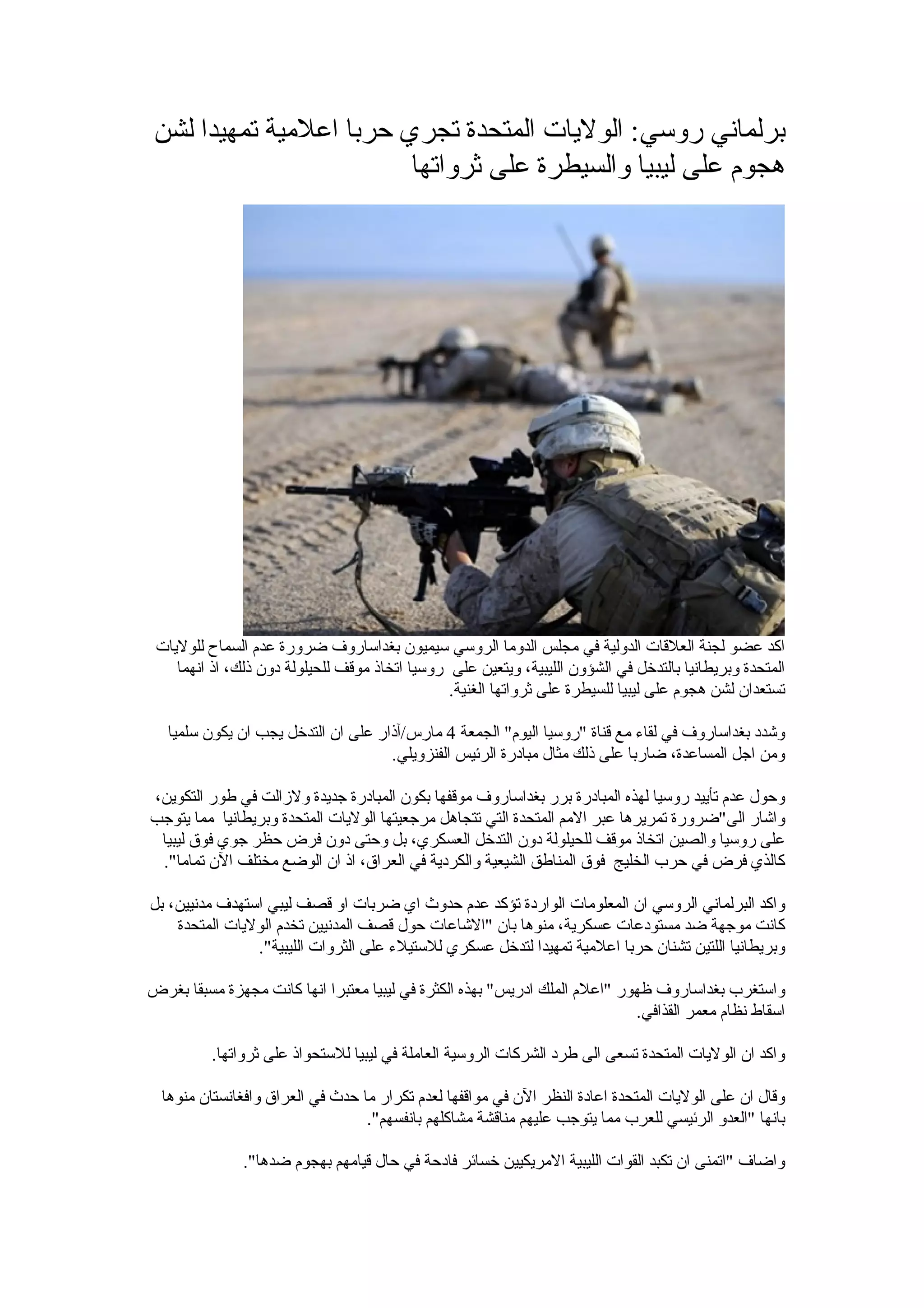 أكد البرلماني الروسي سيميون بغداساروف ضرورة عدم السماح للولايات المتحدة وبريطانيا بالتدخل في الشؤون الليبية، محذرًا من هجوم عسكري من قبلهما للسيطرة على ثروات ليبيا. وشدد على أهمية التدخل السلمي ومراعاة مواقف روسيا والصين في هذا الخصوص، معربًا عن استغرابه من التحريض الإعلامي الذي يروج له الغرب بشأن الوضع في ليبيا. وعبّر عن أمله في أن تواجه القوات الليبية أي هجوم أمريكي بالخسائر.