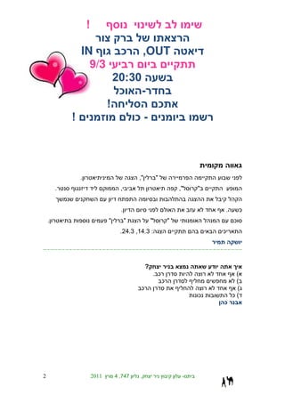 This document discusses events from January to February 2011 in Israel. It notes the dates and times of various protests and demonstrations around the country. Key details include locations, attendance numbers, and issues of concern to the protesters such as cost of living, housing prices, and socioeconomic inequality. The document also provides analysis on public opinion toward the demonstrations and their impact.