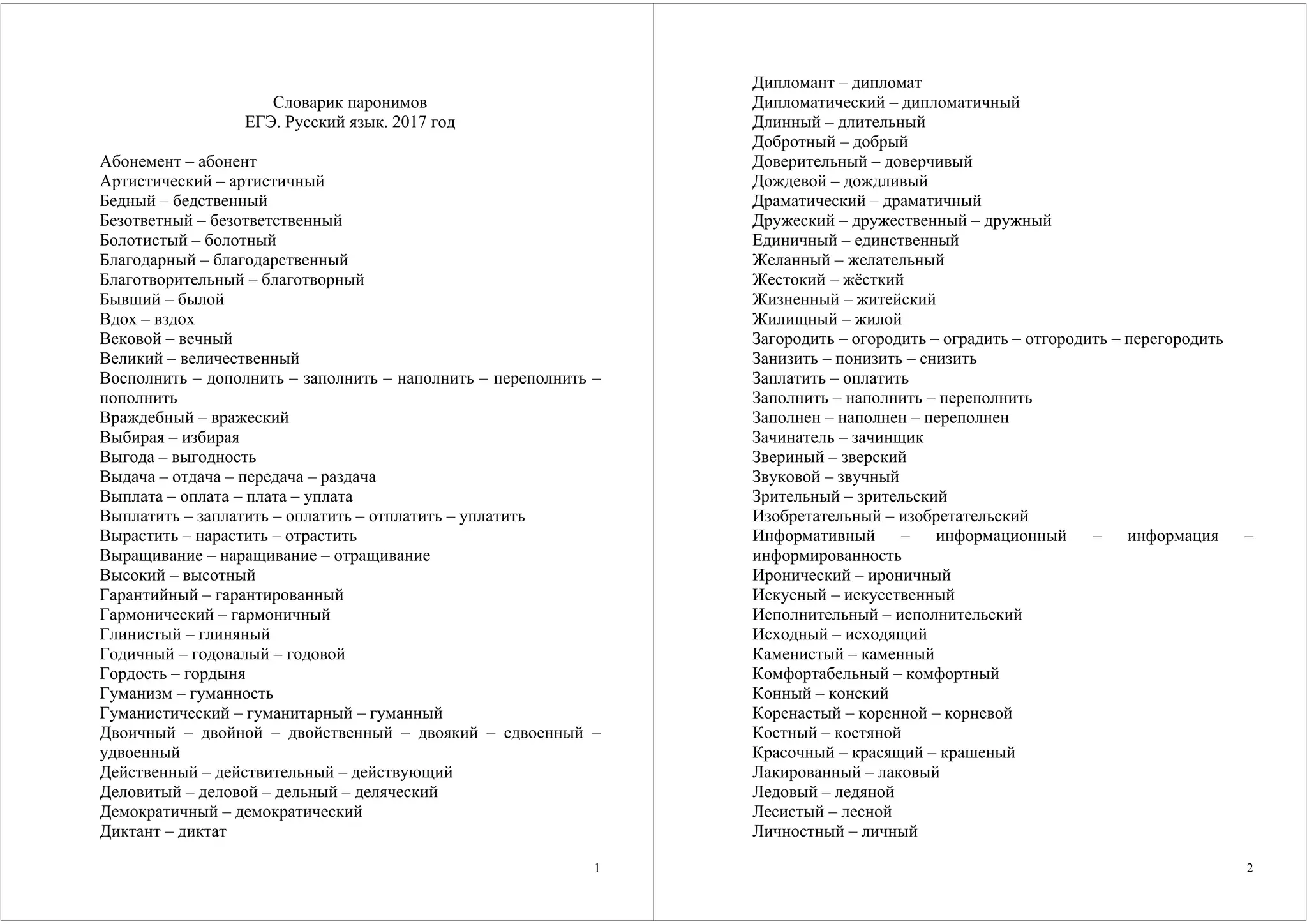 Документ представляет собой словарик паронимов на русском языке, составленный для ЕГЭ 2017 года. В нем приводятся пары слов с близкими значениями, отличающихся по значению или стилистике. Словарь включает термины из различных областей, таких как экономика, искусство, право и другие.