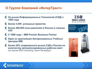 Документ описывает современные технологии автоматизации документооборота, предоставленные группой компаний «Интертраст», включая опыт повышения эффективности управления и снижения издержек. Основное внимание уделяется внедрению корпоративных информационных систем, оптимизации бизнес-процессов и обеспечению надежной защиты информации. Приведены результаты внедрения системы, включая сокращение времени поиска документов и повышения производительности труда.