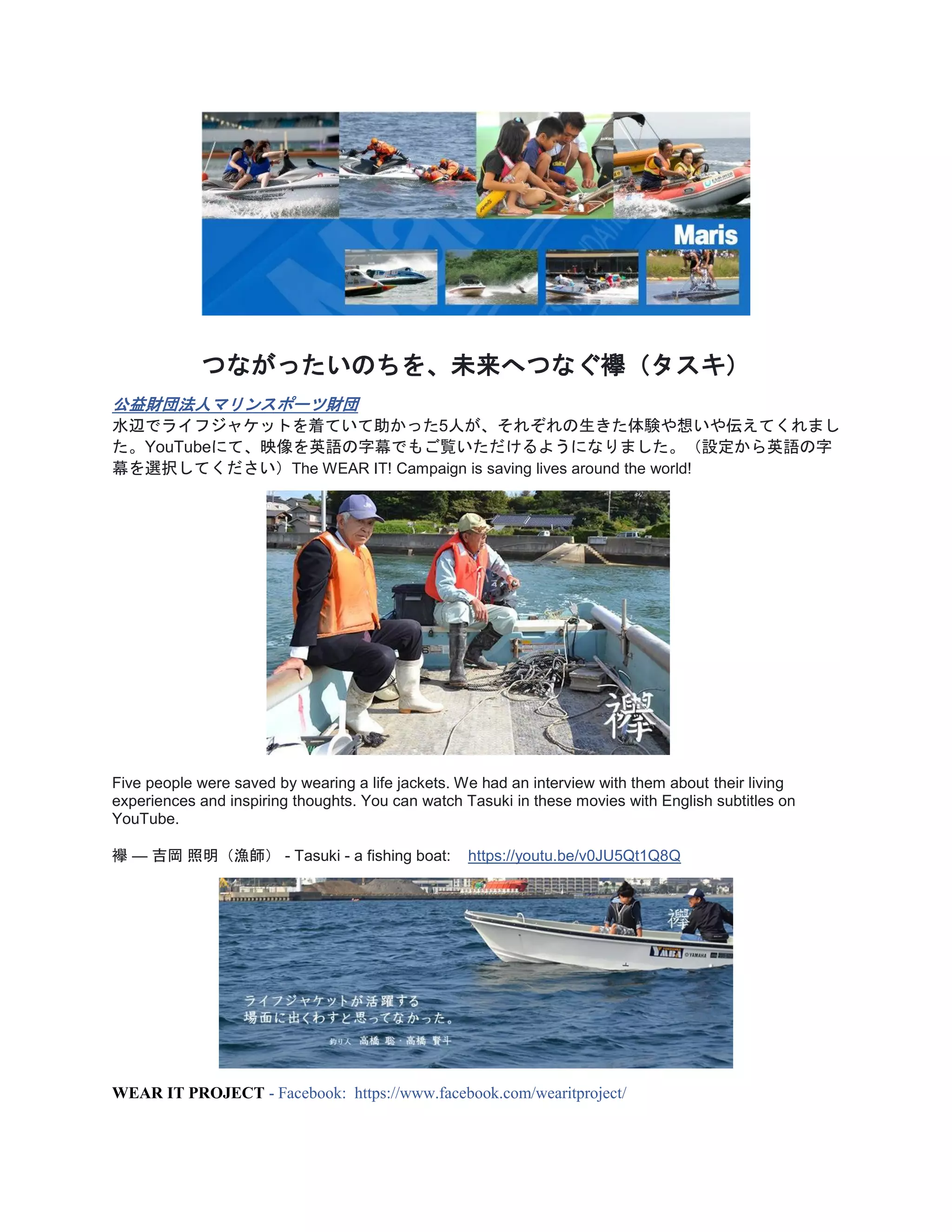 Five people were saved by wearing a life jackets. We had an interview with them about their living experiences and inspiring thoughts. You can watch Tasuki in these movies with English subtitles on YouTube.