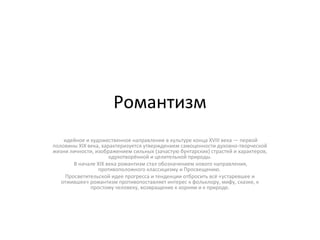 Документ рассматривает романтизм как идейное и художественное направление конца XVIII — первой половины XIX века, подчеркивая его стремление к утверждению духовной и творческой жизни личности. Он противопоставляет романтизм классицизму и просвещению, акцентируя внимание на фольклоре, природе и простом человеке. В тексте также упоминаются выдающиеся художники романтической эпохи, их работы и вклад в искусство.