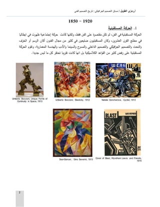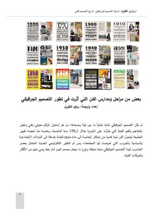 تناقش الوثيقة تطور التصميم الجرافيكي كفن عبر التاريخ وتأثير الحروب والتغيرات الاجتماعية على هذا الفن. تتطرق إلى الحركات الفنية مثل المستقبلية، داديزم، والبنائية، ودور مدرسة باوهاوس كمرجع في التصميم الحديث. كما تسلط الضوء على أهمية الملصقات في التواصل والدعاية، وتأثير التصميم على الثقافة والمجتمع.